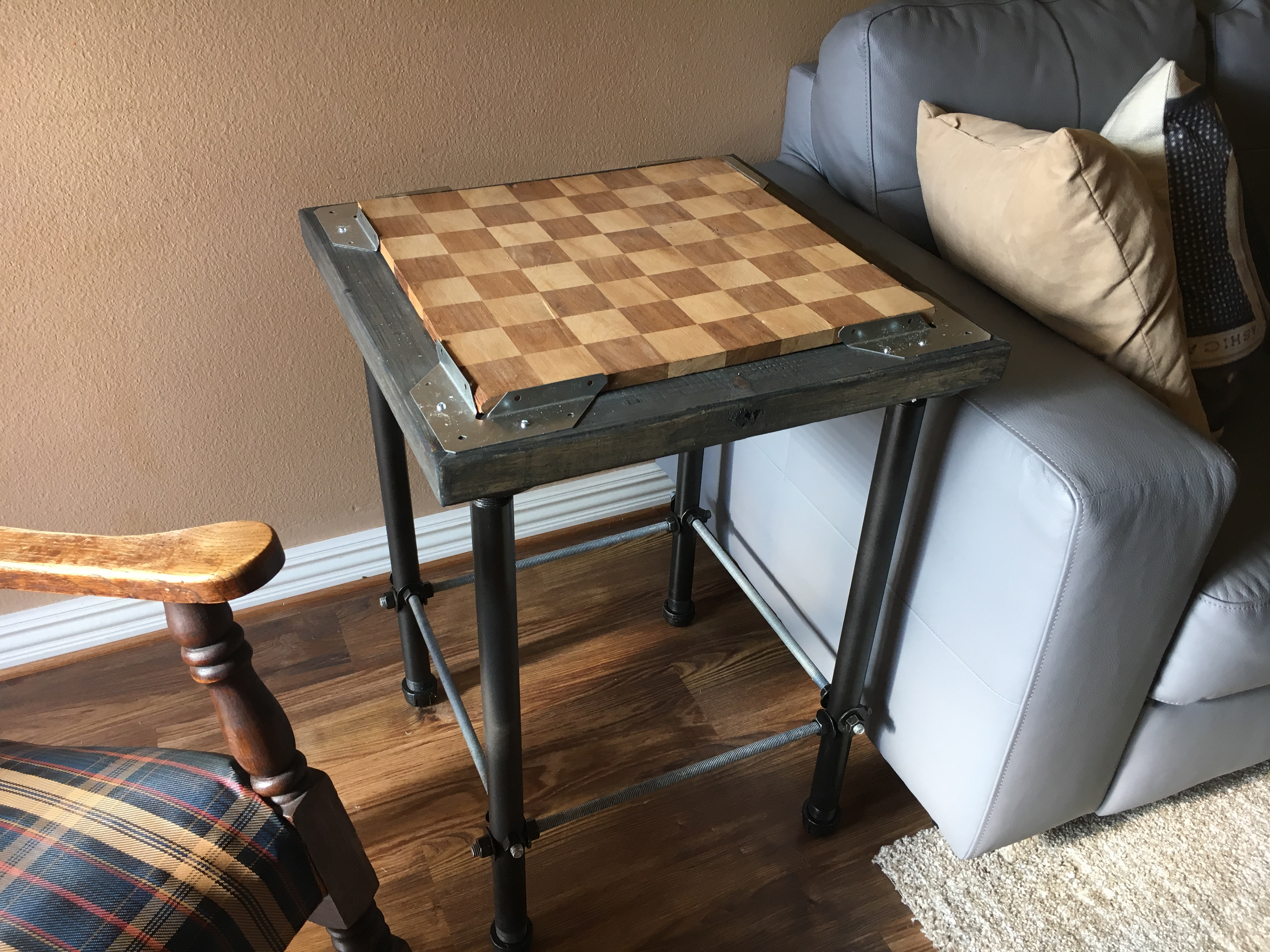 Built around a cool checkerboard cutting board I found in a flea market. The legs are made of lead pipe.